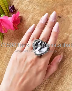 Best Selling Solid 925 Silver Plated Rhodium and Green Zebra Jasper Ring Adjustable Statement Jewelry Sterling Silver Gemstone