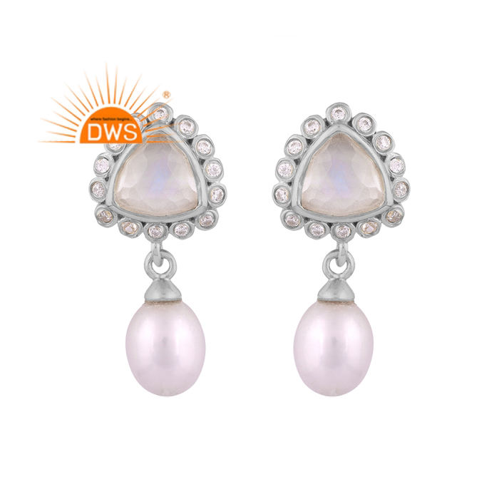 Best Selling Sterling Silver Natural Cz , Pearl & Rainbow Moon Stone Gemstone Dangle Earring Custom Jewelry Manufacturer
