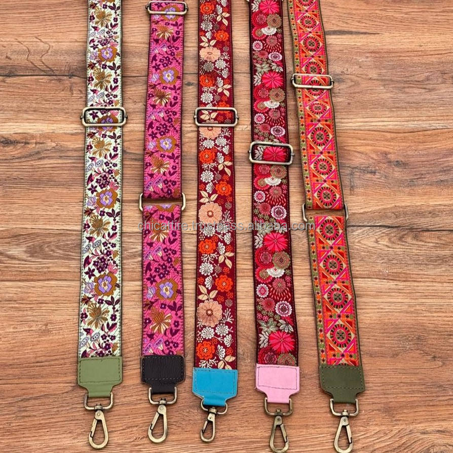 Best Selling Suede Leather Banjara Bag Strap Embroidered Crossbody Purse Strap Floral Boho Replacement Guitar Strap for Women's