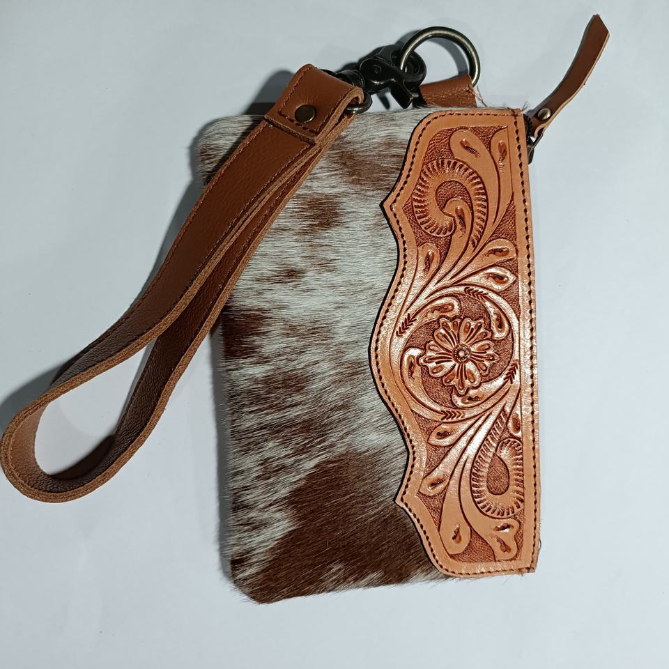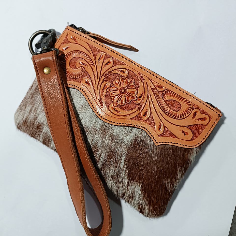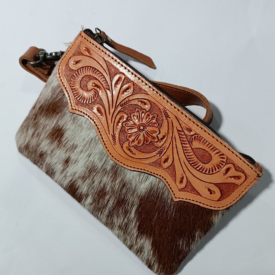 Best Selling Tan Cowhide Fur Leather Clutch Wallet Long Hand Tooling Bag Floral Cotton Lining Unbeatable Price Unisex Fashion