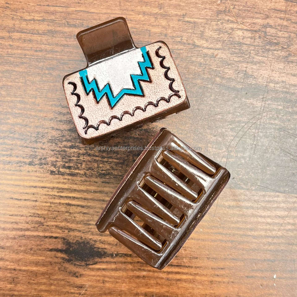 Best Selling Western Inspired Handmade Tooled Leather Mini Hair Clips Geometric Engraved Claw Clip Accessories for Women's
