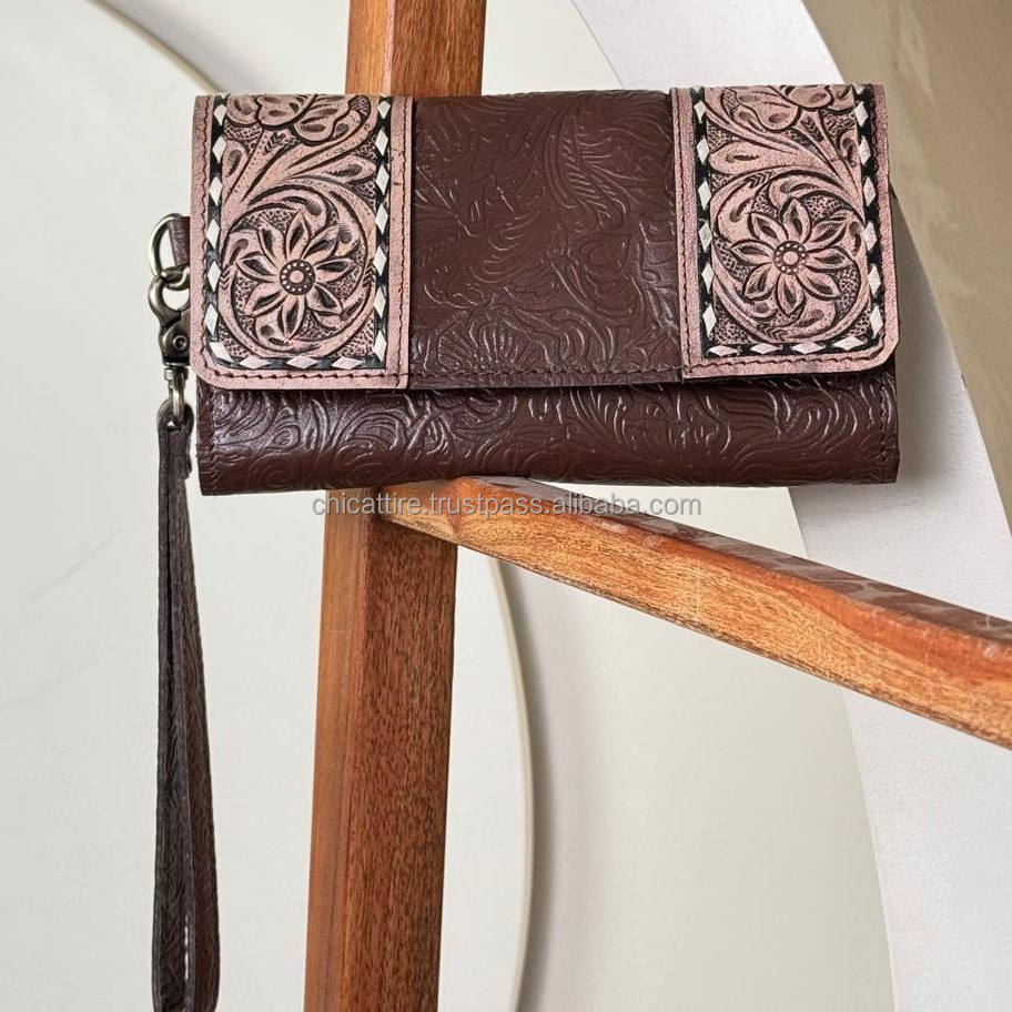 Best Selling Western Style Hand Tooled Leather Wristlet Wallet Embossed Floral Genuine Leather Clutch Credit Card Holder Purse