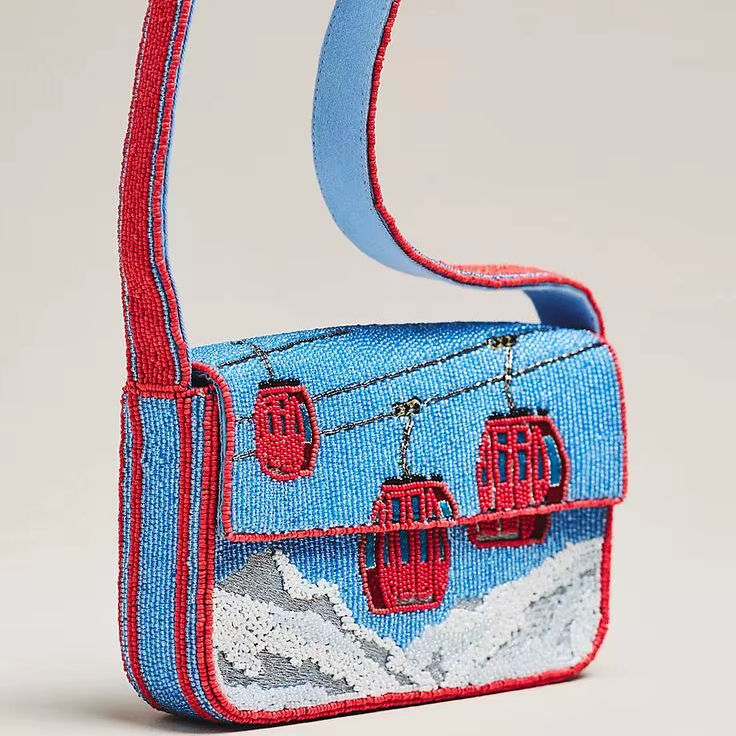 Best Selling Women Beaded Shoulder Bag Small Blue Winter Ski Scene Rectangular Purse With Gondola Embroidery And Seed Beads
