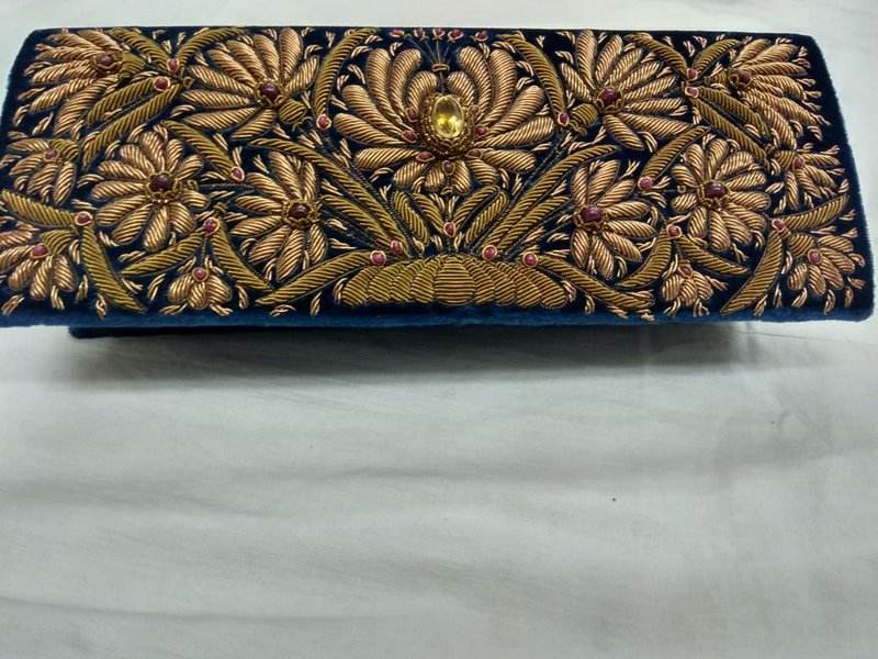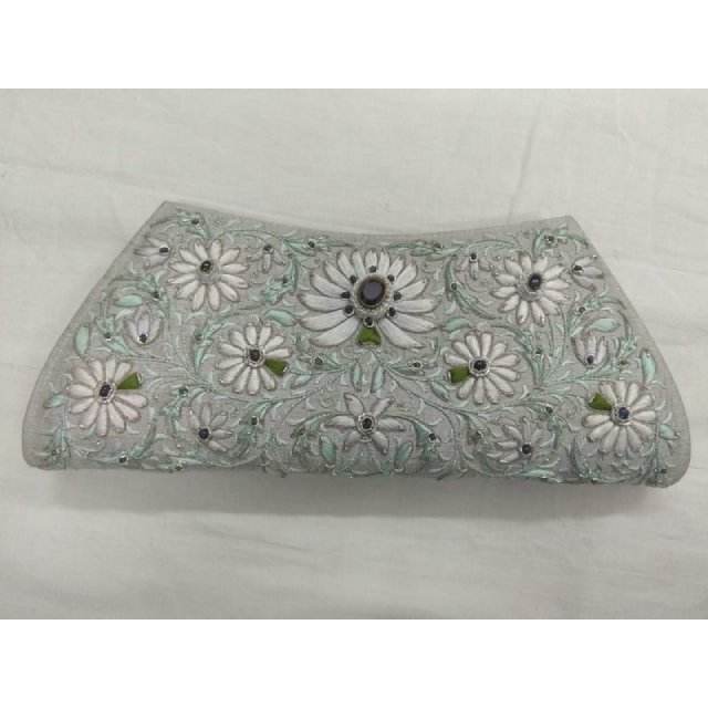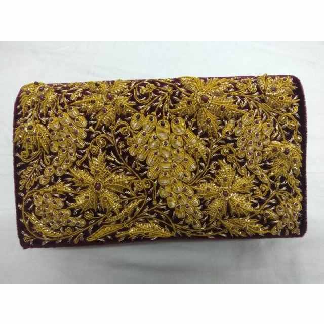 Best Women's Fashion-Forward Canvas Clutch with Zipper Top Zari Embroidery Semi Gemstones Pearl Chain Beading Decoration
