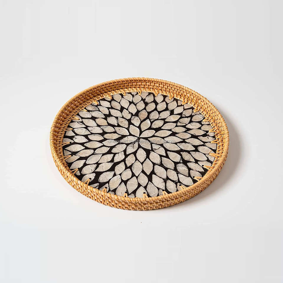 Best Choice Mother of Pearl Rattan Tray Round Shaped with MOP Handicraft Rattan Wicker