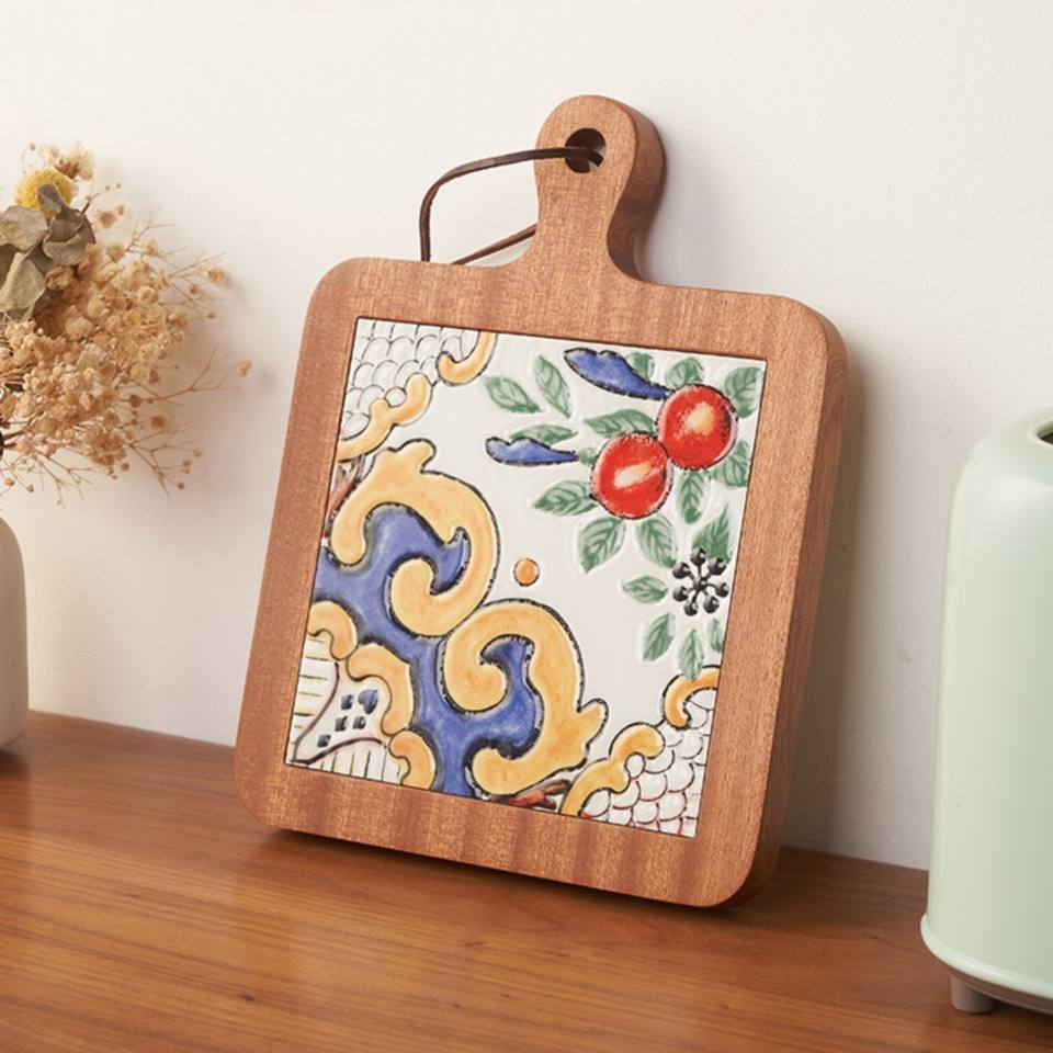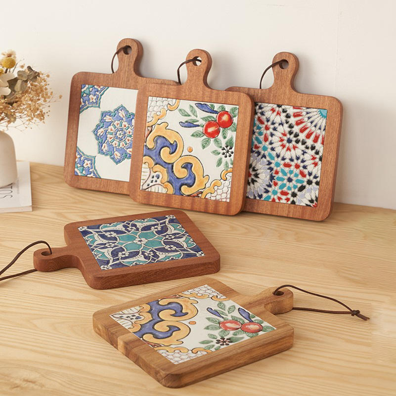 Best price wood holder stand for pots and pans with centered ceramic pad handmade wooden pot trivet coaster