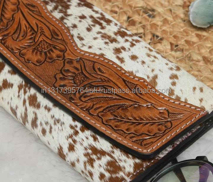Best Selling Vintage Tooled Fur Leather Clutch Carved Leather Wallets Leather Clutch Women Designed Purse