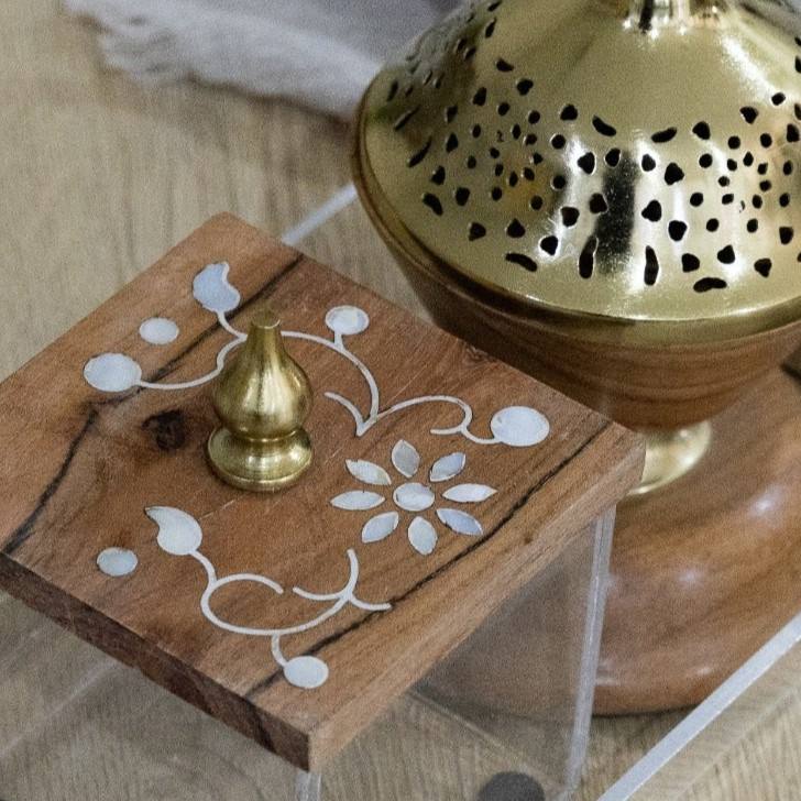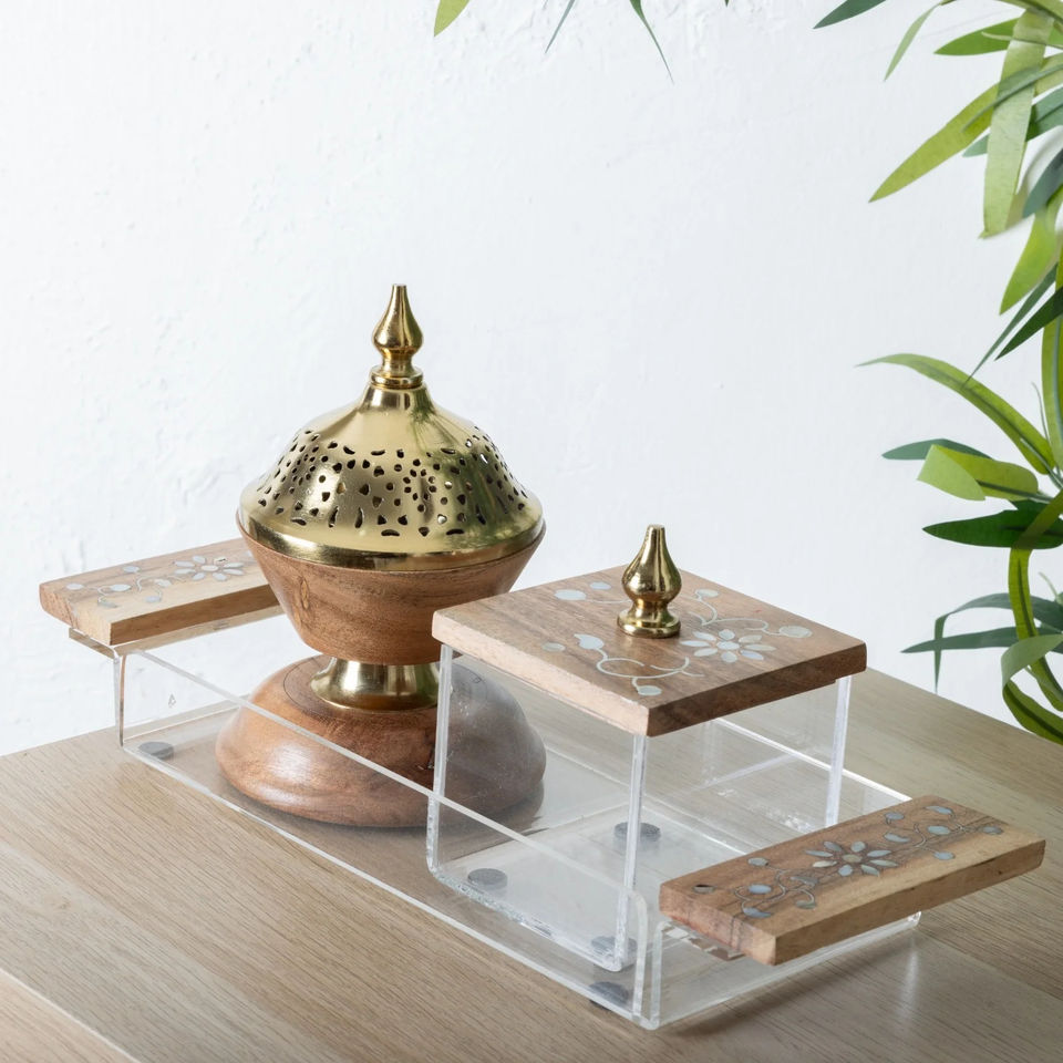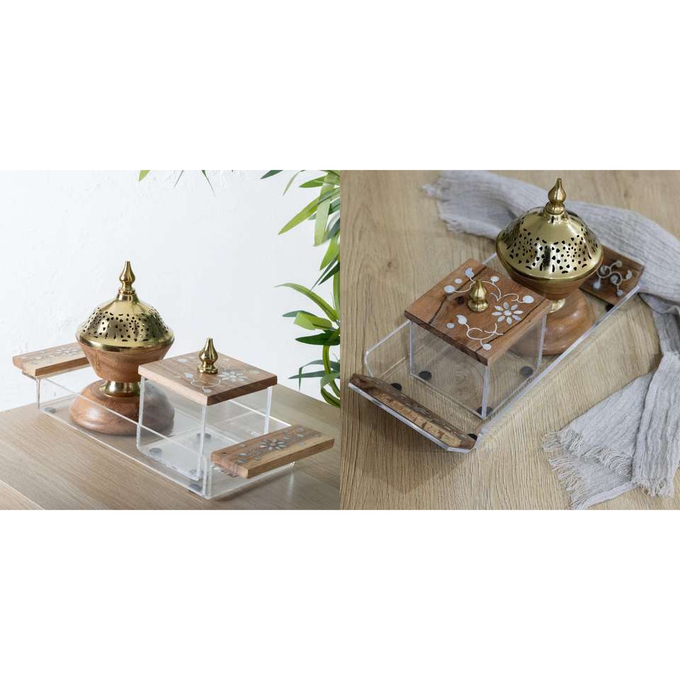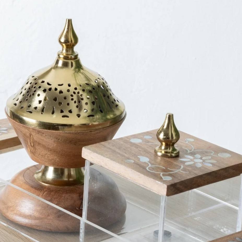 Bestseller Arabic MOP Wooden Incense Bakhoor Burner Etching Gold dome top Acrylic Tray Ramadan & Eid Gift for Middle East & Gulf