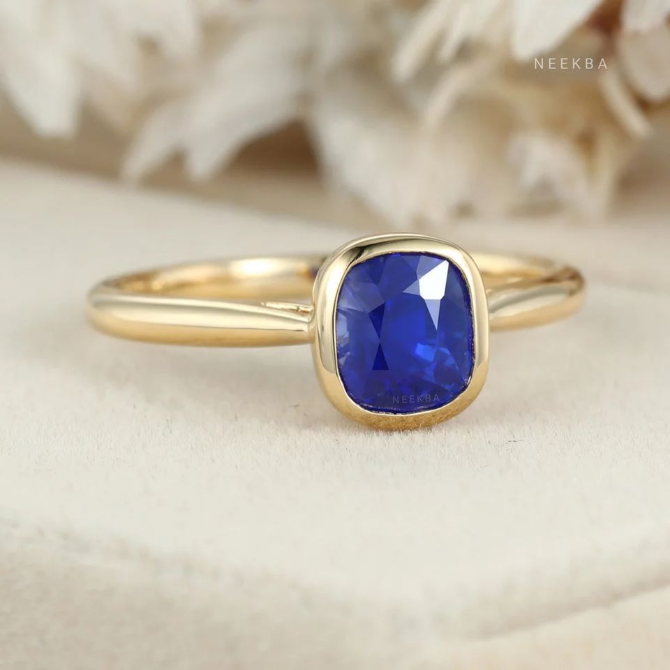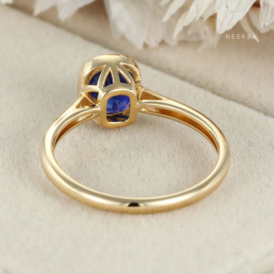 Bezel Set Elongated Cushion Cut Lab-Grown Blue Sapphire Fine Ring Handcrafted 10K Solid Yellow Gold Art Deco Solitaire Ring