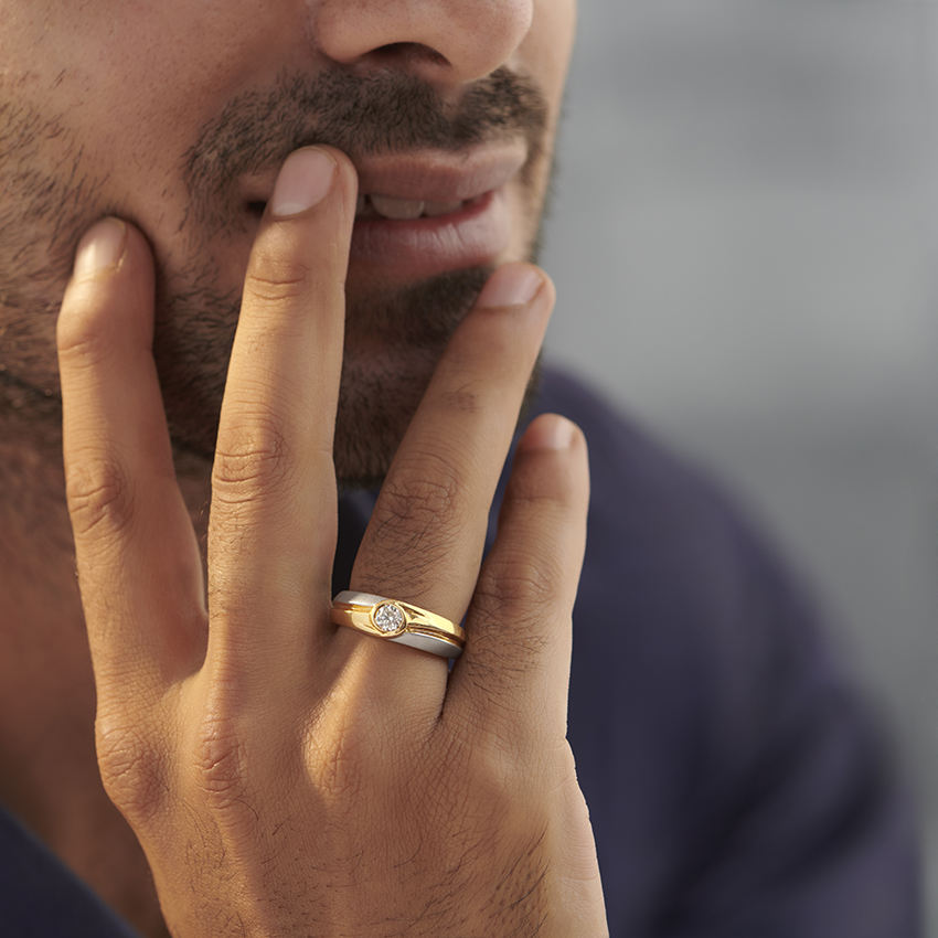 Bezel Set Round Cut Moissanite Engagement Ring Original 18K Yellow Gold Two Tone Thick Band Solitaire Wedding Ring for Groom