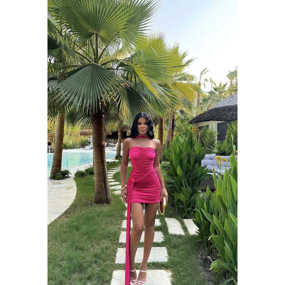 Bielli Fuchsia Bodysuit Skirt Set Casual Solid Woolen Denim Skinny Fit Short Tops Above Knee Length for Summer & Autumn Seasons