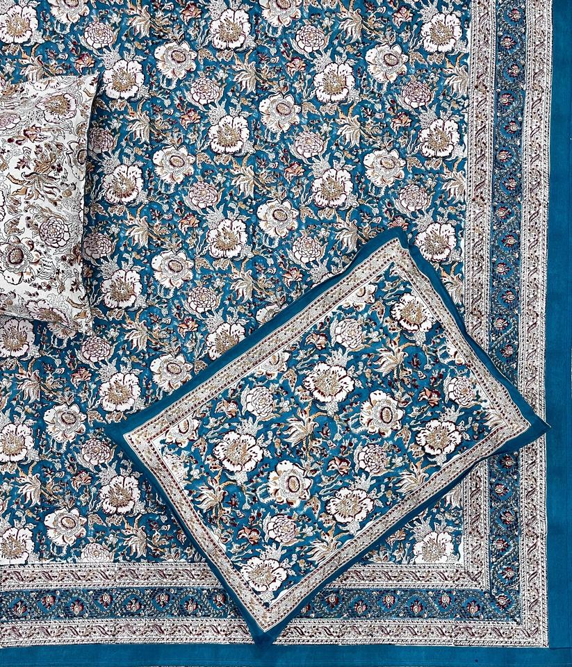 Classic Blue Cotton Cooling Queen Bed Sheet Big Floral Print Bohemian Style 2 Reversible Pillow Cases Hand Block Printed 3-Piece