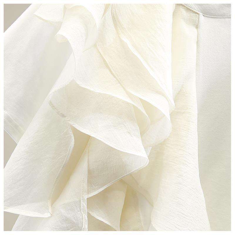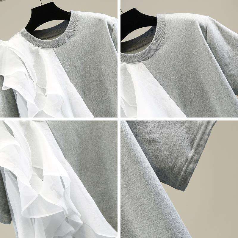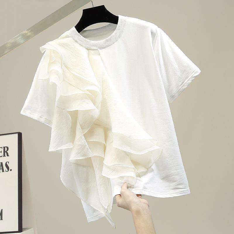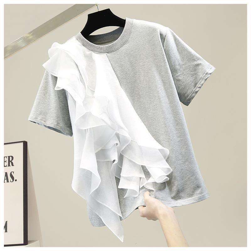 Big Ruffle Layered Patchwork Color-Crossing Pullover Women's Short Sleeve T-Shirt Top Fashion