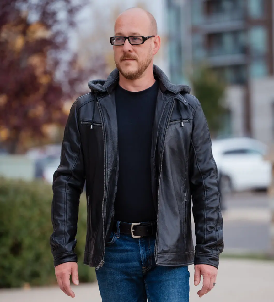 Biker Jacket with Belt: Rugged black leather biker jacket with quilted arms, wide lapels, and a waist belt at wholesale prices.