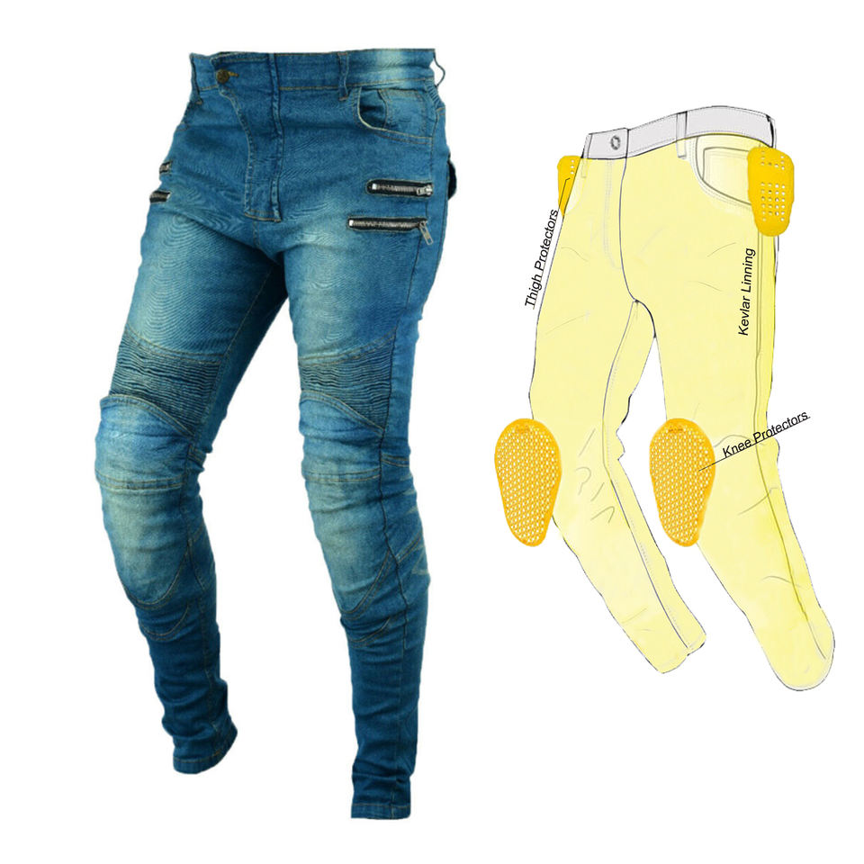 Biker Protective Motorcycle Jeans for Men for Protection Plus Size Slim Fit Stone Wash Blue Zippered Pockets Knee Paneling