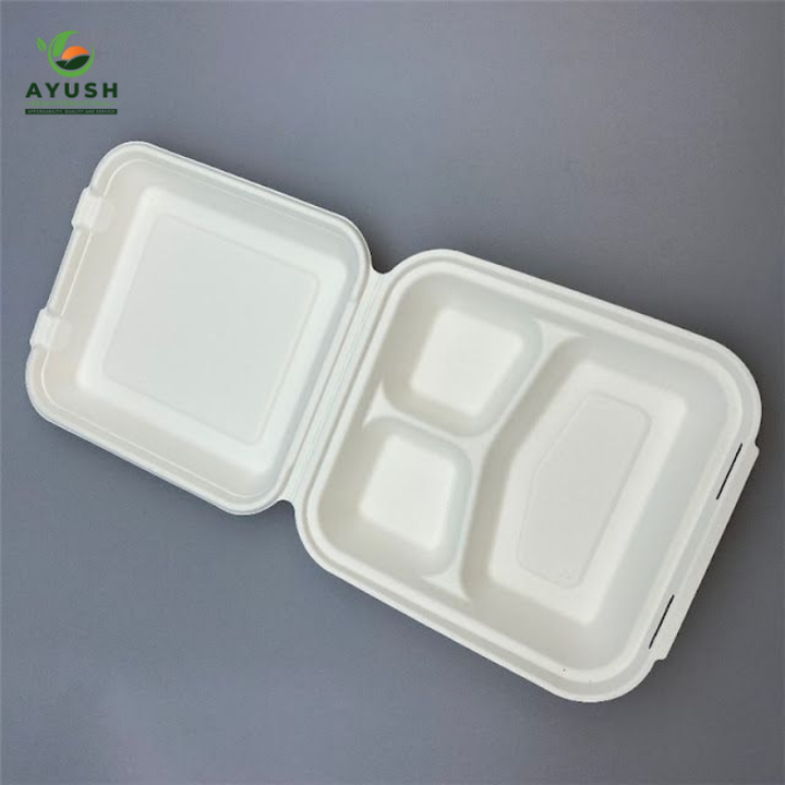 Biodegradable Bagasse 9x9 Inch 3CP Clamshell Container with Lid made of sugarcane pulp for High Volume Wedding Catering