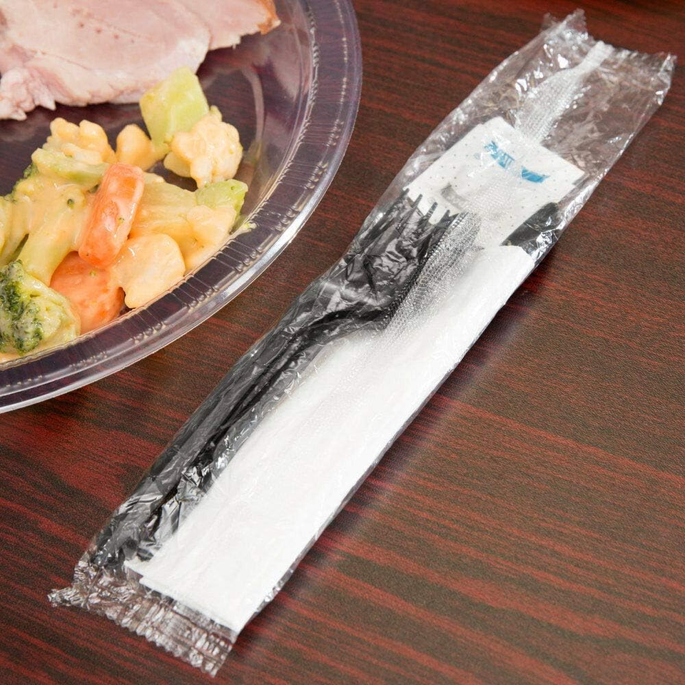 Biodegradable Disposable Party Cutlery Packs with Knife Fork Spoon Napkin Salt & Pepper Sets Black Plastic Individually Wrapped