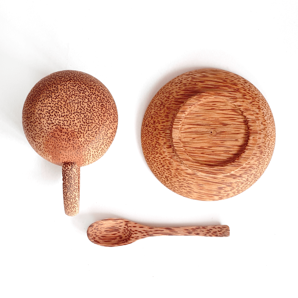 Biodegradable coconut palm wood coffee cup sets coco wooden tea cups with spoons and saucers customized logo acceptable