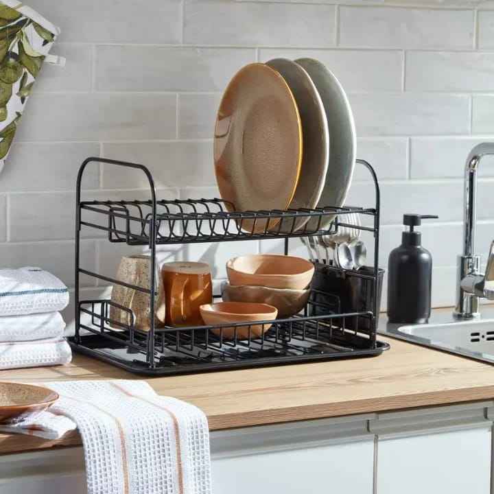 Black 2 Tier Dish Drying Rack with Drainboard and Cutlery Holder Metal Kitchen Countertop Organizer for Plates Bowls and Mugs