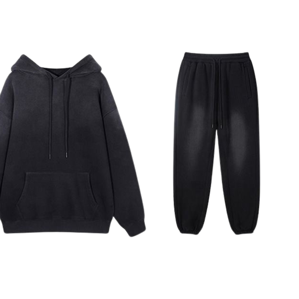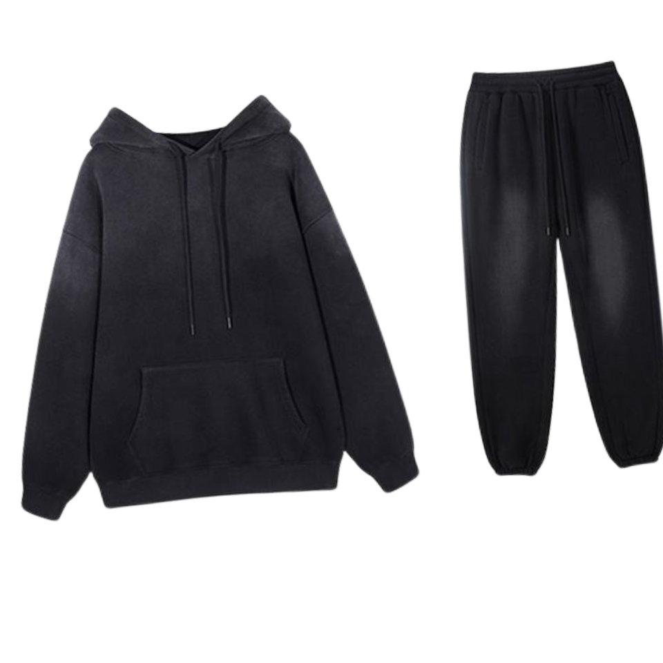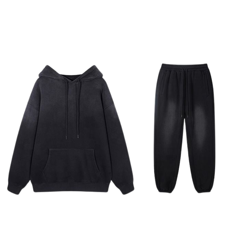 Black Acid Washed Hoodie Tracksuit Men Vintage Faded Look Pullover Hoodie Elastic Waist Jogger Pants Set Streetwear Winter