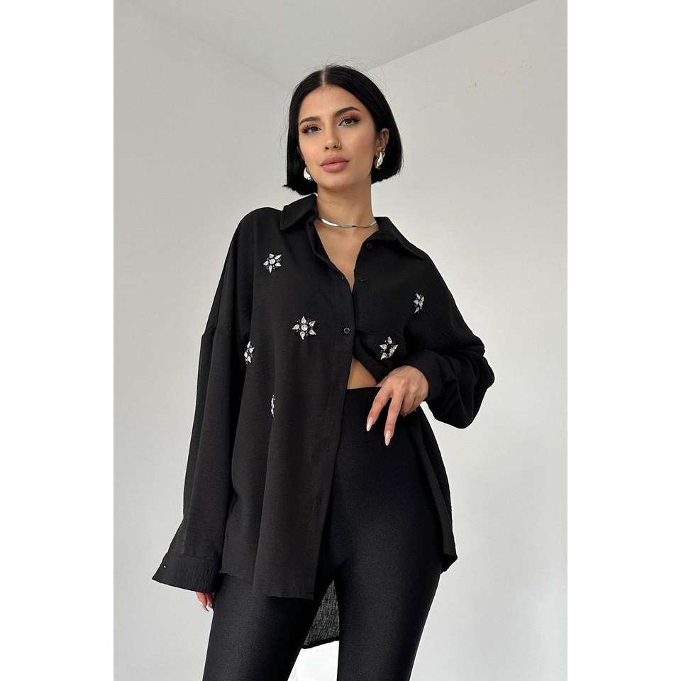 Black Asymmetric Button Down Shirt Women Casual Poplin Blouse Everyday Wear