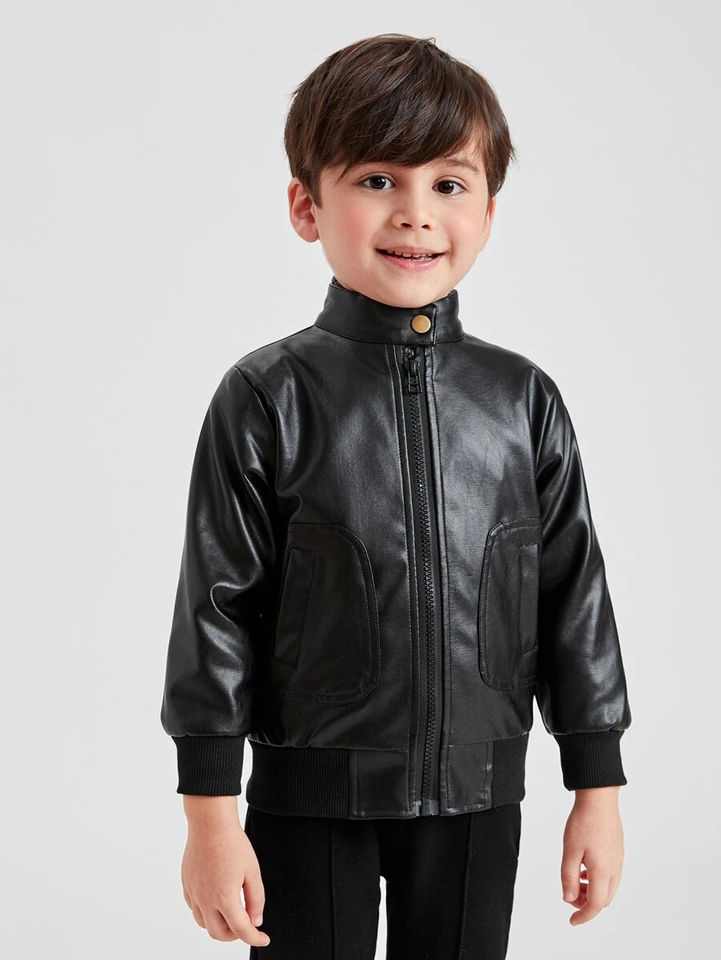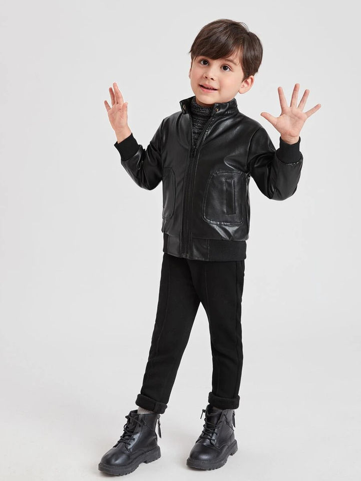 Black Autumn Winter Fashionable Boys' 100% Waterproof Velvet Leather Jacket Hooded Front Warm Outerwear for 2-13 Breathable