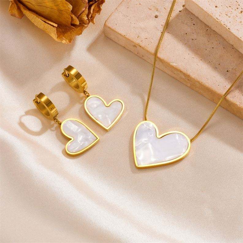Black BLUE White Shell Heart Pendant Necklace Ear Clip, Suits 18K Stainless Steel Love Heart Shaped Necklace Ear Clip, Suits