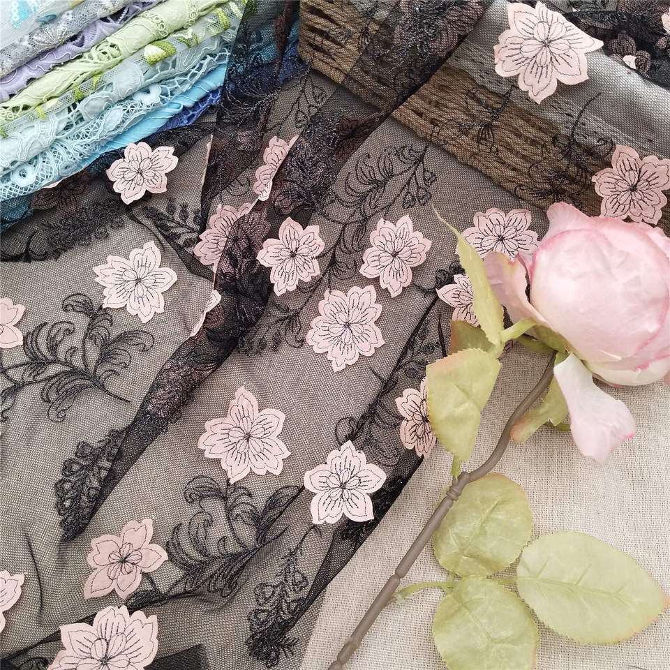 Black Base Mesh Pink Flowers Fabric Lace Fabric Embroidered Luxury French Net Style New for Work Clothes Wedding Dress Sexy