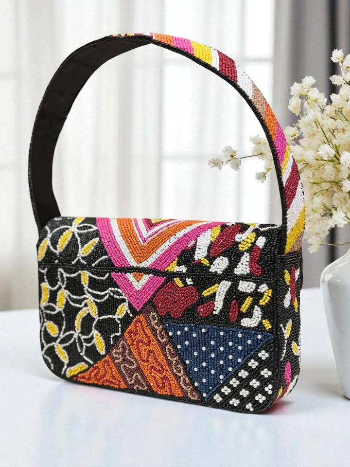 MULTI CRAFT Black Beaded Handmade Embroidery Clutch Boho Patchwork Design Customizable Color/Size/Logo Stylish Evening Bag Strap