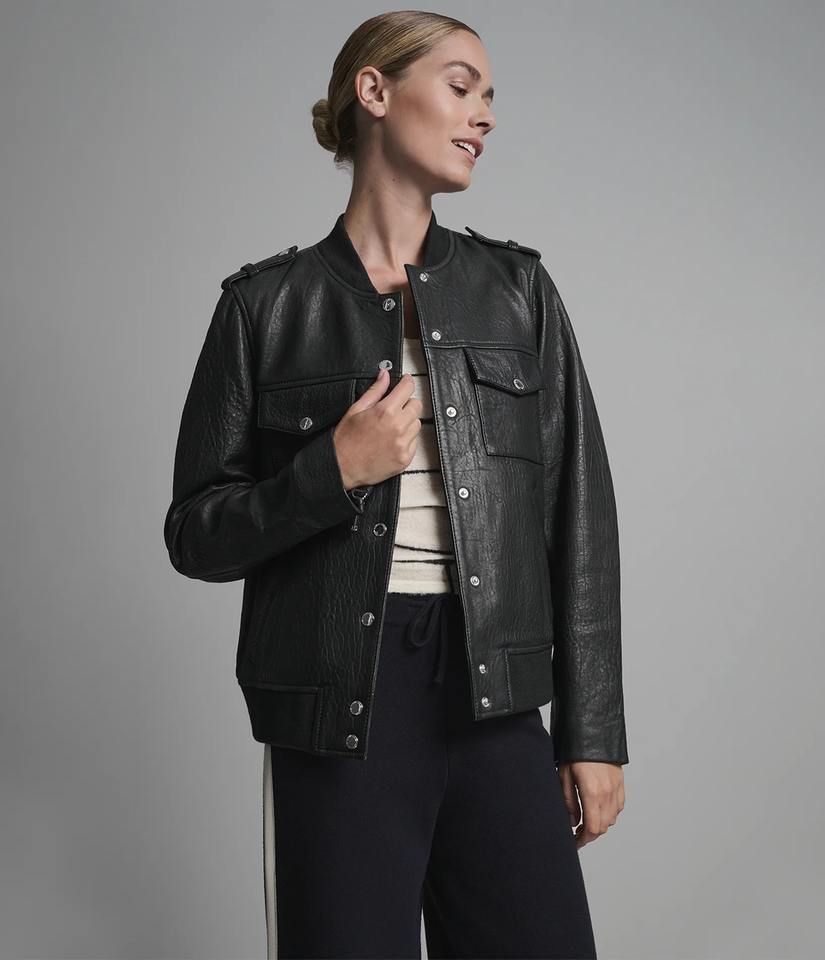 Black Collarless Leather Bomber Jacket Women Regular Zipper Crew Neck Boxy Fit Trendy Casual Winter Outerwear Cotton Lining
