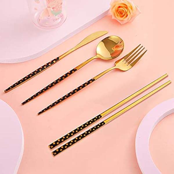 Black Color Handles Gold Color Plated Finished Stainless Steel Flatware Set Of 5 Fork Spoon Knife Fork Dishwasher Safe Cutlery