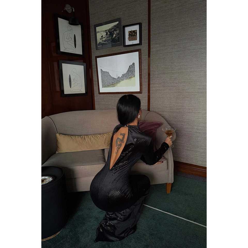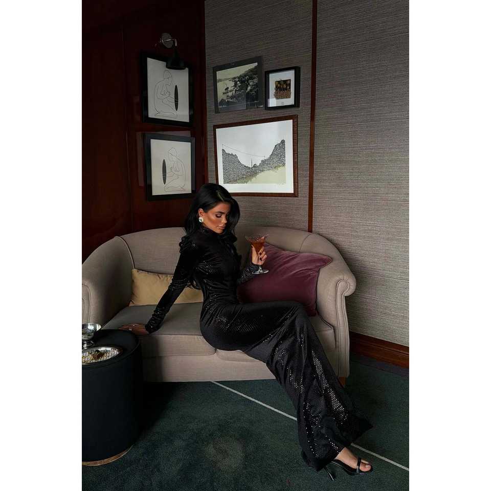 Black Crocheted A-Line Prom Dress with Long Sleeves Glitter & Beading Decoration Empire Waistline Size XS to XL