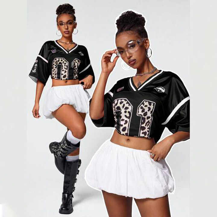 Black Crop Mesh Jersey Top with Leopard Print Streetwear V-Neck Sports Shirt Custom Fashion Short Sleeve Football Men's T-Shirts