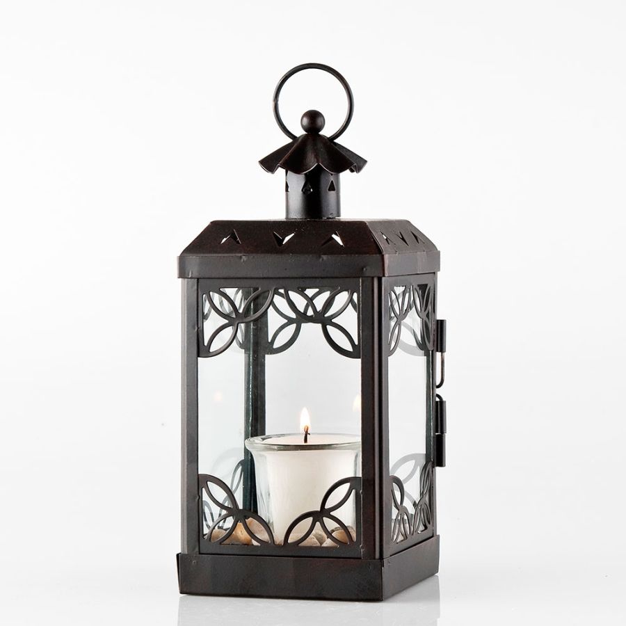 Black Decorative Metal Candle Lantern with Glass and Available Gravure Printing Perfect for Elegant Moroccan Wedding Decor