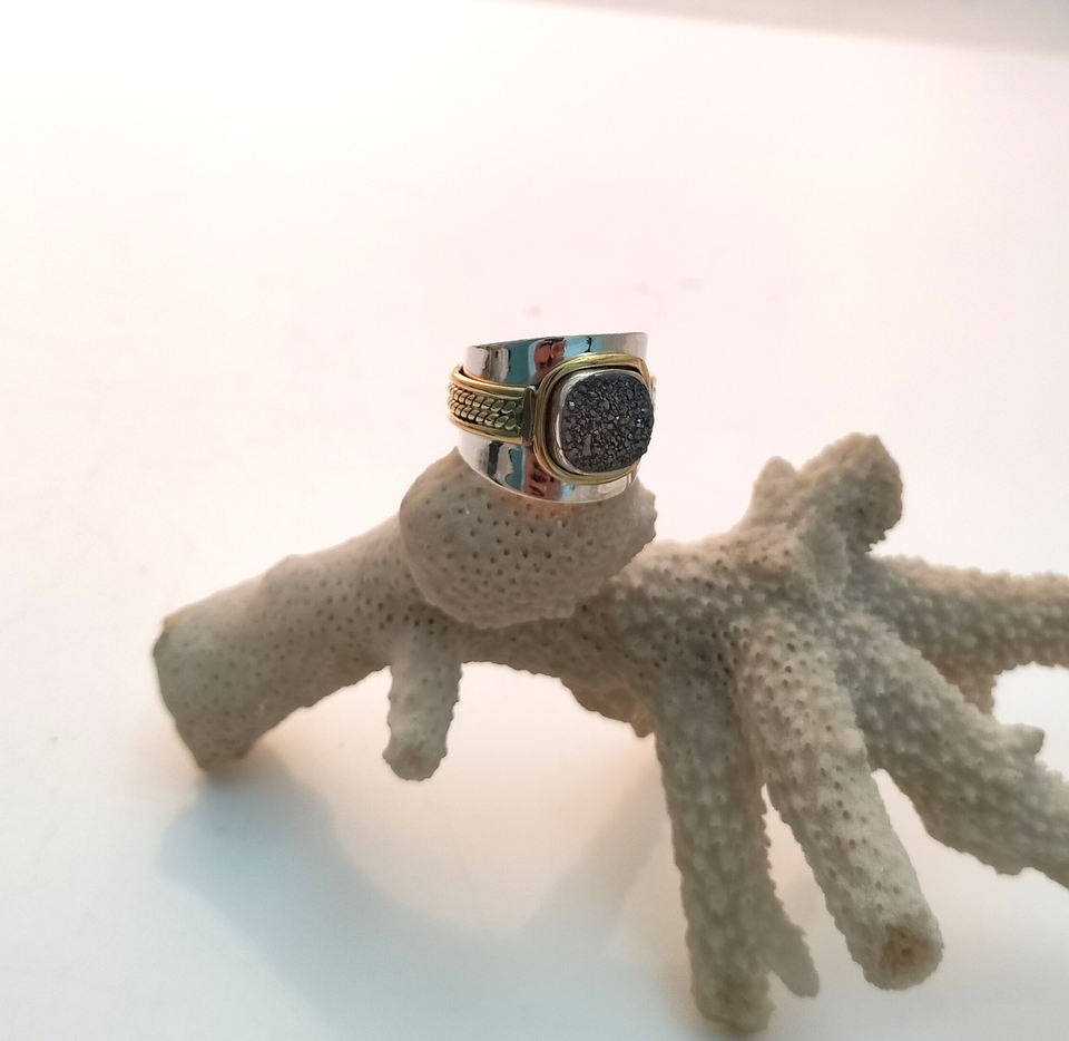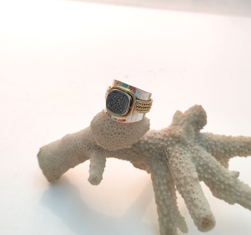 Trendy Dainty Sterling Silver 925 Finger Rings for Women & Girls Black Druzy & Flower Bezel Setting for Parties Fashion Jewelry