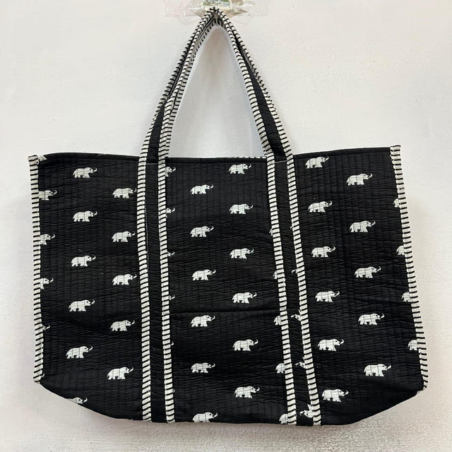 Black Elephant Print Quilted Cotton Tote Bag Handmade Womens Shoulder Carry Reusable Shopping Travel Beach Large Capacity Eco