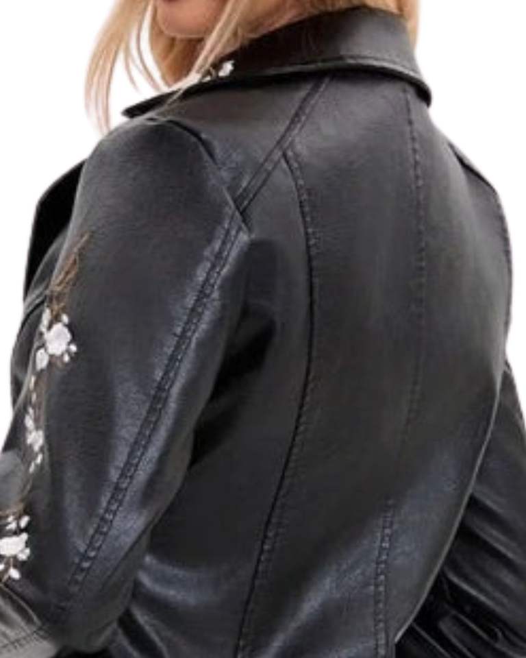 Black Faux Leather Jacket Women Floral Embroidery Slim Fit Biker Zipper Coat Fashion Casual Outerwear Streetwear Winter Top Hot