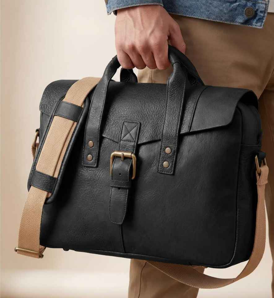 Black Genuine Leather Lightweight Men's Laptop Briefcase 15 Inch Business Messenger Bag Crossbody Shoulder Vintage