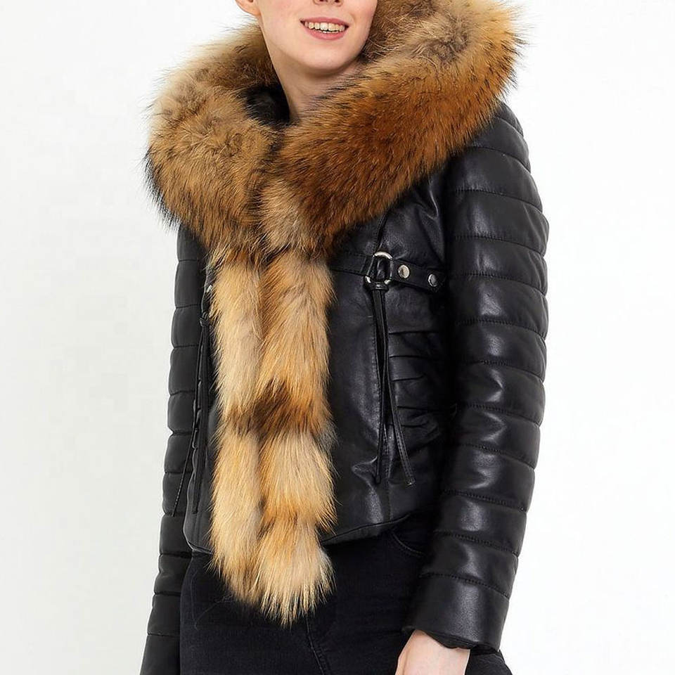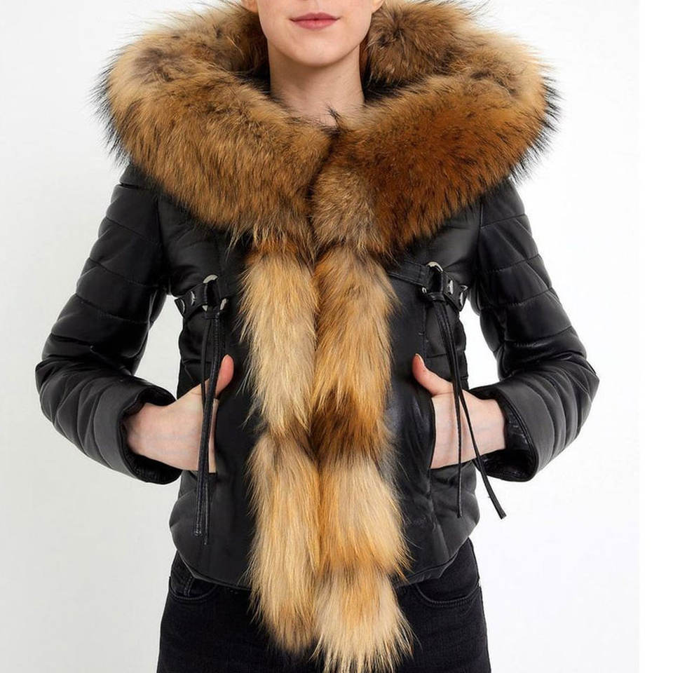 Black Genuine Sheep Leather Women Puffer Jacket with Quilted Design Real Fox Fur Hood Warm Winter Coat