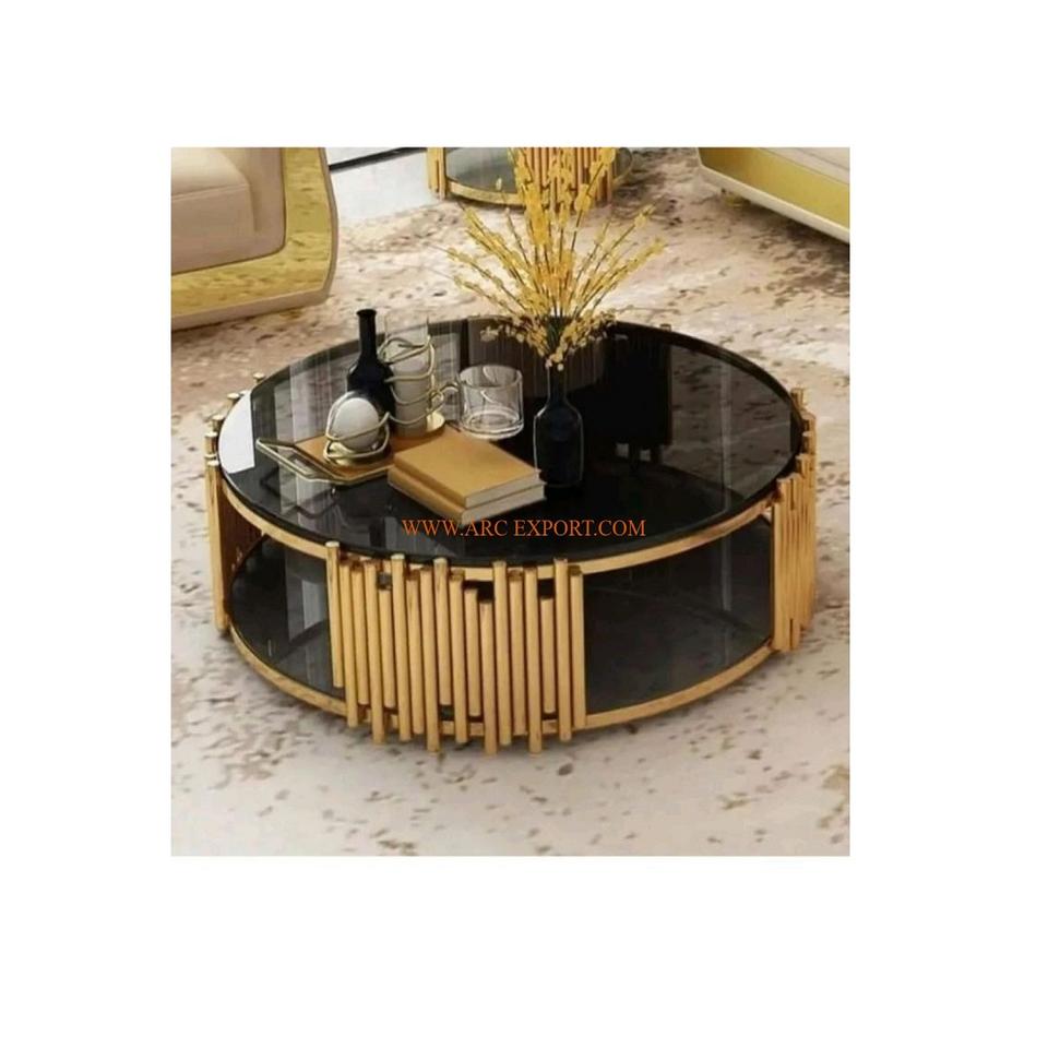 Black Glass Top Round Bed Room Center Table With Gold Plated Metal Stand Modern Elegant Designing Living Room Furniture Table