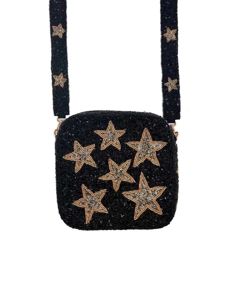Handmade Black Gold Box Bag Purse with Stars Beading & Zipper Closure Unique Polyester Embroidery Gift for Her