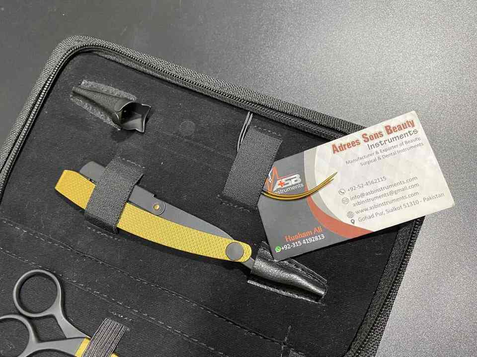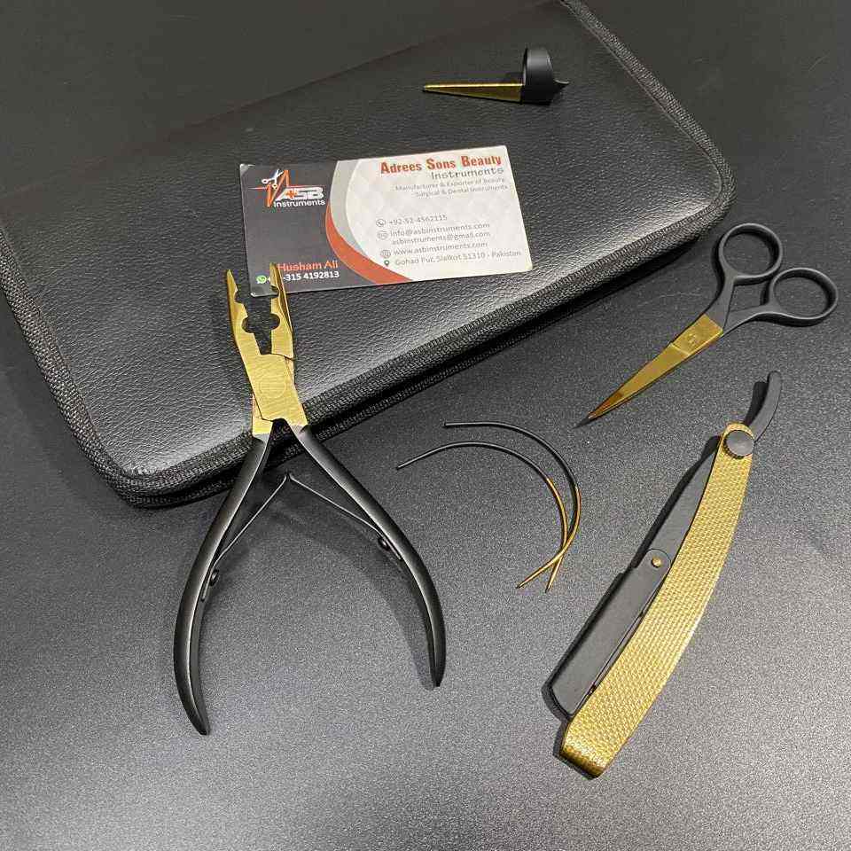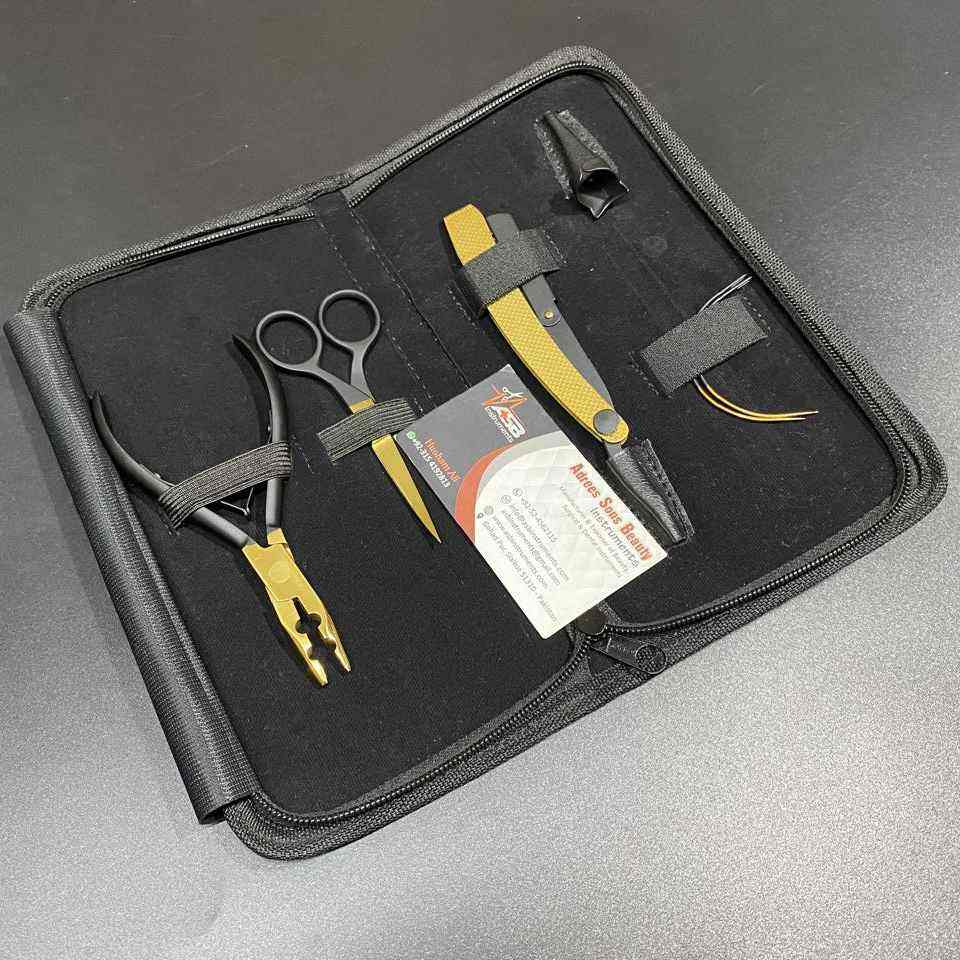 Black Gold Custom Logo Hair Extension Tool Kit Set Stainless Steel Scissor Razors and Hair Sectioning Clip Loop