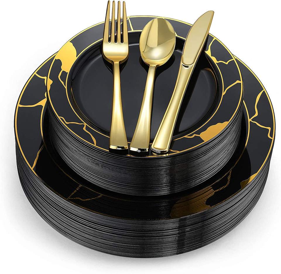 Black Gold Pattern Plastic Dinnerware Set Silverware Includes Forks Spoons Knives Cups Napkins Plates for School Occasions Free