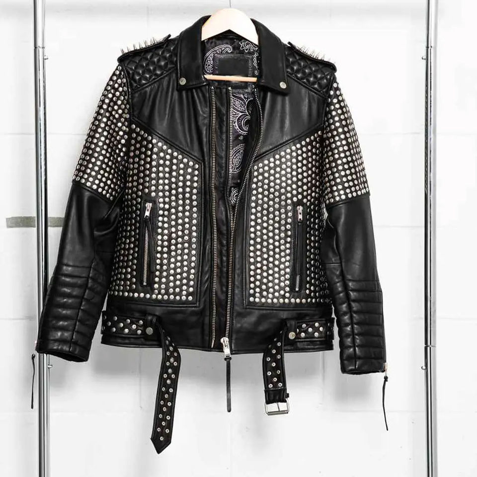 Black Gothic Style Studded Leather Jacket for Men Warm Punk Rock Leather Jacket for Bikers Racers