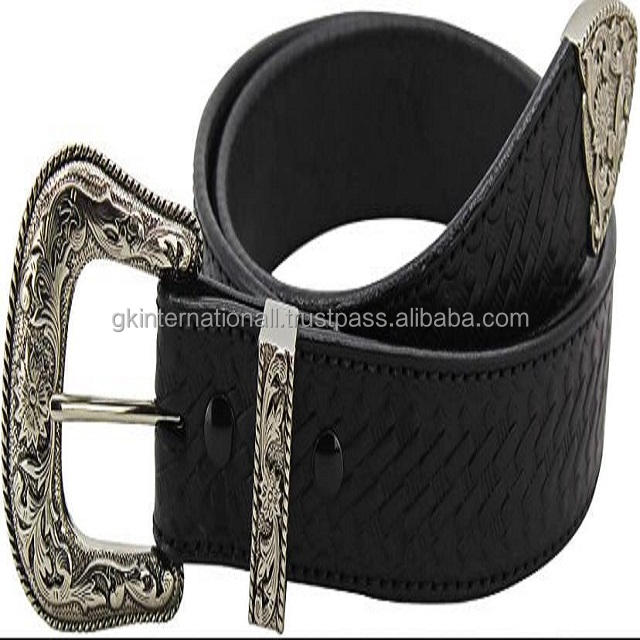 Black Hair on Hide Genuine Floral Embossed Western Tooled Leather Belt New Design 2021 with Designer Three Piece Heavy Buckle