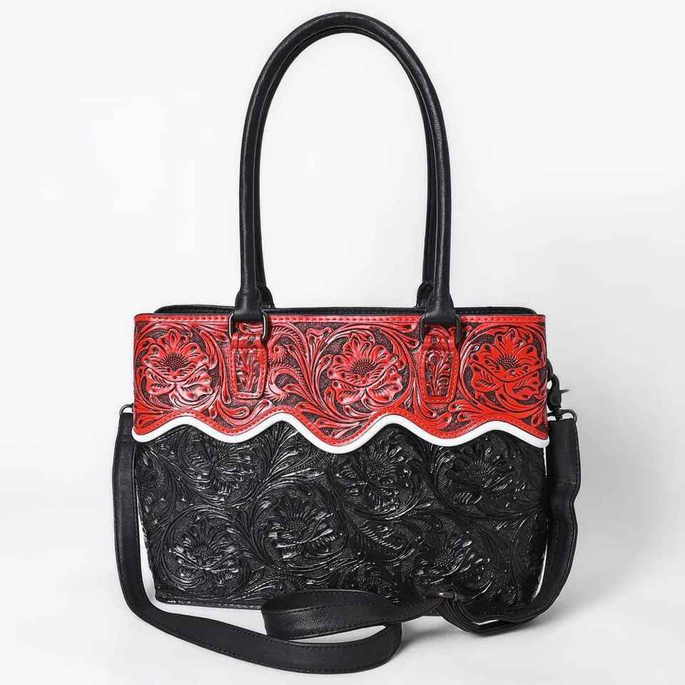 Black Hand Tool Leather Tote Bag for Girls Sling Satchel Floral Carving Purse with Zipper Closure at Wholesale Price