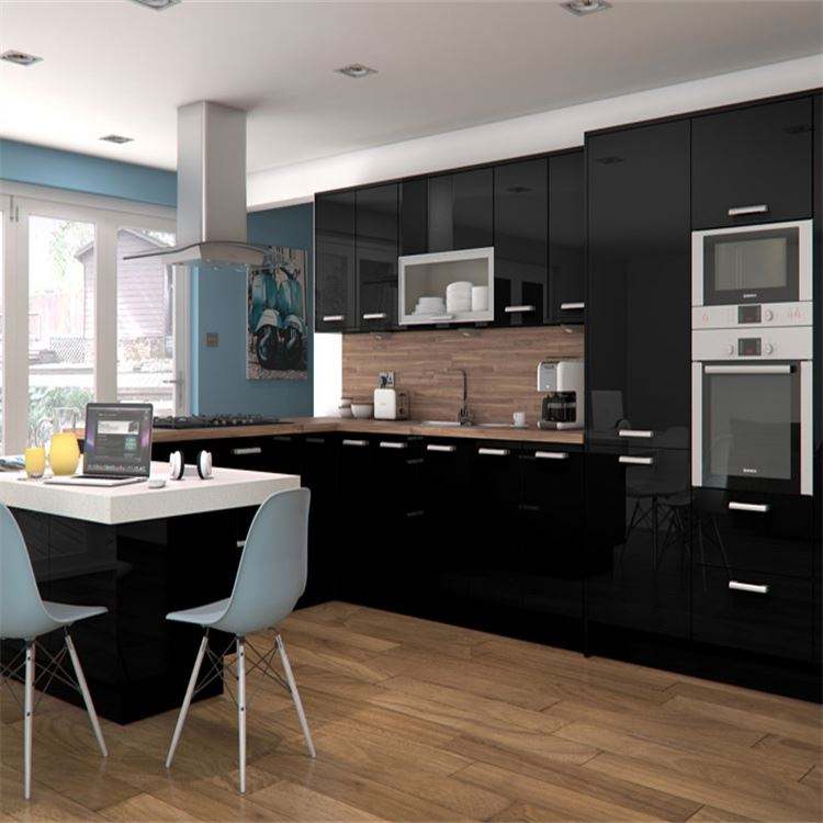 Black High Glossy Lacquer Kitchen Cabinet Set Complete Soft Close Top PVC Glass Door Modern Designs Panel Wood Faucet Marble