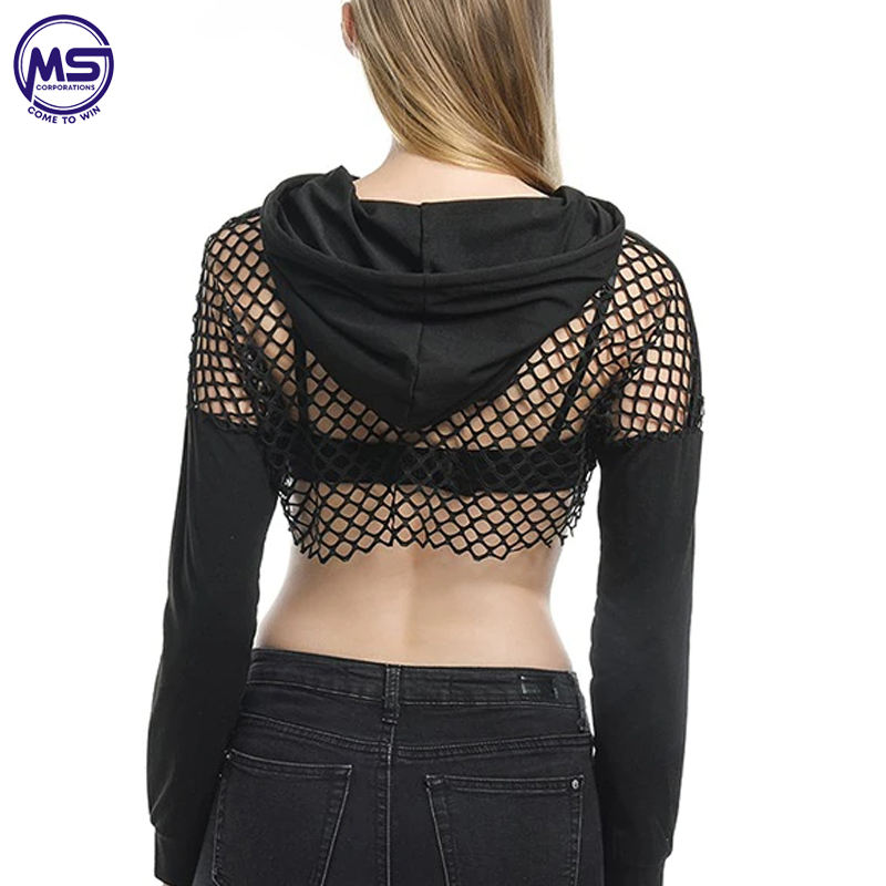 Black Hoodies for Women 2022 Hollow Out Crop Tops Mesh Patchwork Short Sweatshirt Long Sleeve Autumn Crop Tops Hoodies