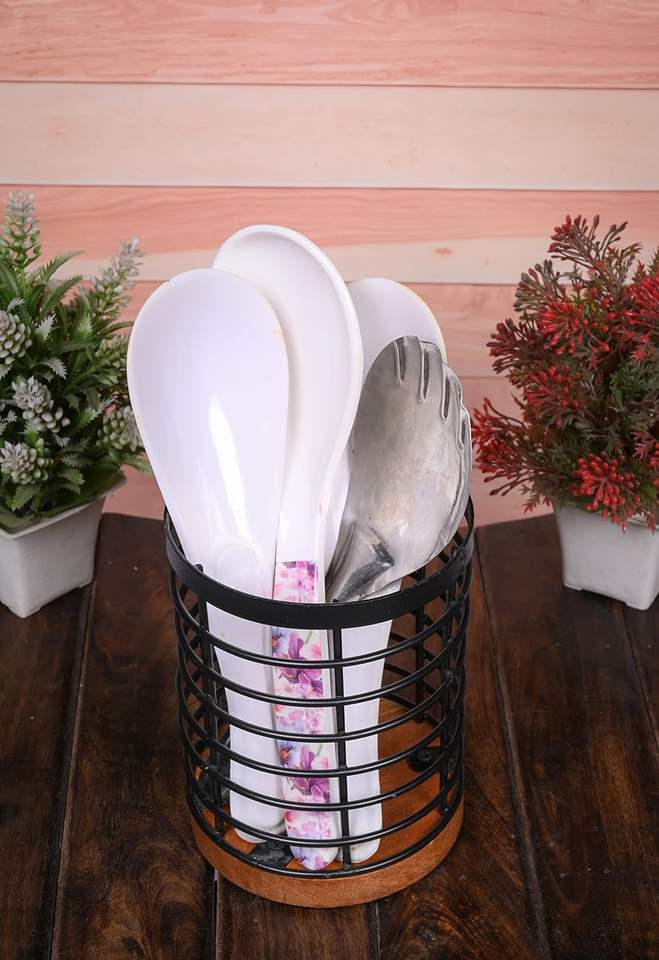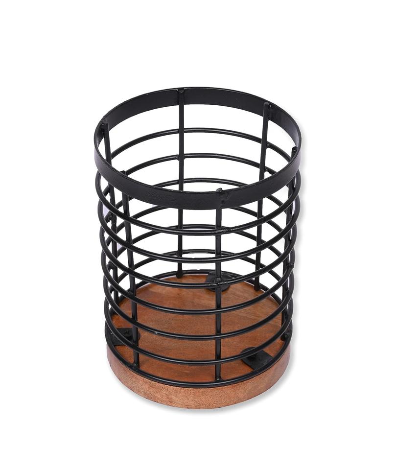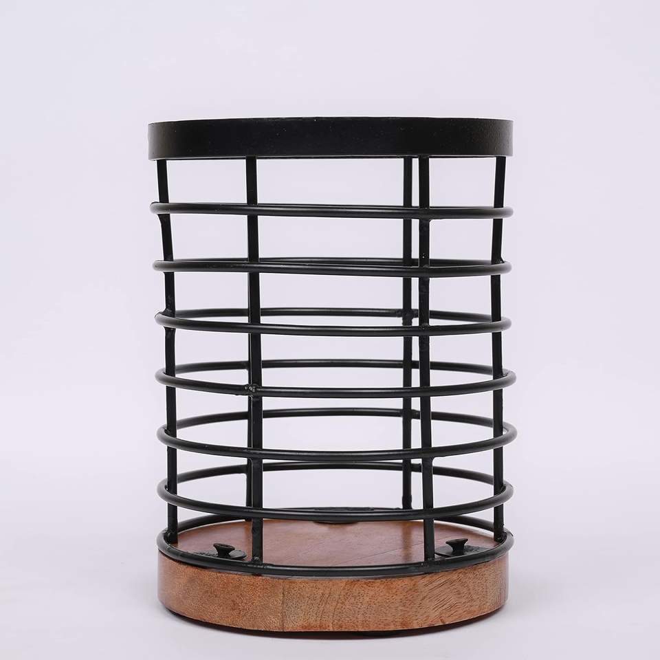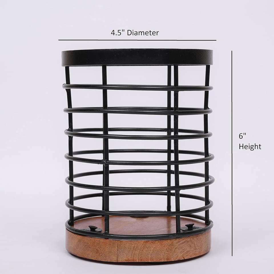 Black Iron Kitchen Utensil Holder with Acacia Wooden Base Round Flatware Storage for Countertop (4.5" X 4.5" X 6")