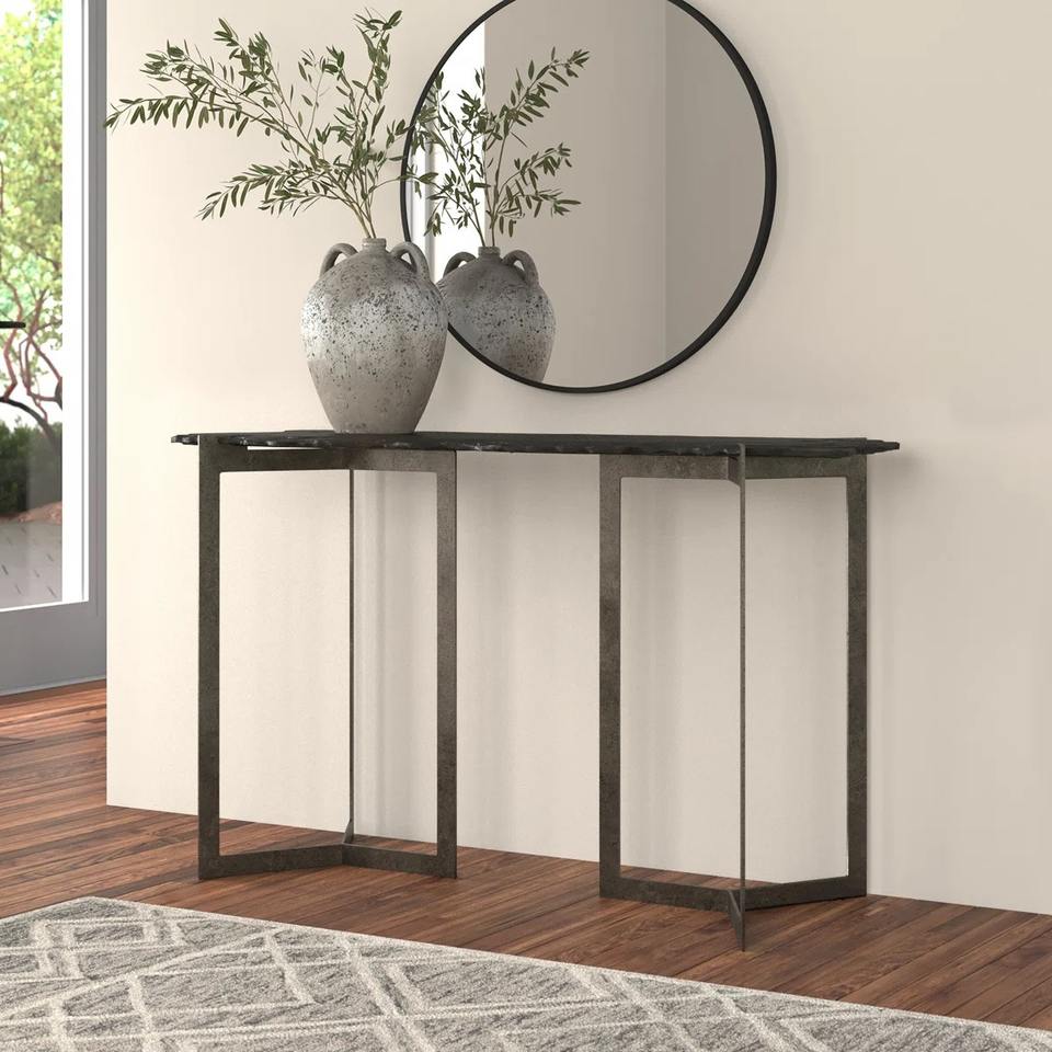 Black Iron Living Room Console Table Featuring Geometric Open Base and Rough Edge Detail Modern Design